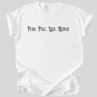 Simple. Effective. Non-negotiable. The Push Pull Legs Repeat T-Shirt is for women who train with intention and trust the process. Made from 100% pr...